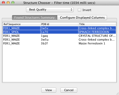 Jalview can automatically select the best structures according to meta-data provided by the PDB. For alignments with no existing structure data, the 'Best Quality' structure for each sequence will by default be selected, but clicking on the drop down menu allows other criteria to be chosen, including Resolution (only defined for X-Ray structures), Highest Protein Chain etc. When 'Invert' is selected, structures are selected in reverse order for the current criteria (e.g. worst quality rather than best).