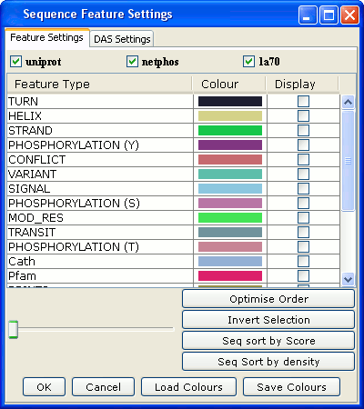 Features may be highlighted with either a single colour or a feature colourscheme based on either the scores associated with that feature or from the feature's description (e.g. to distinguish different names associated with a DOMAIN feature).