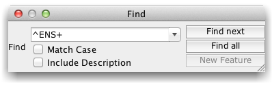 "Find next" will find the next occurrence of the specified and adjust the alignment window view to show it, and "Find all" highlights all matches for a pattern. The "New Feature" is a quick way to highlight and group residues matching the specified search pattern throughout the alignment.