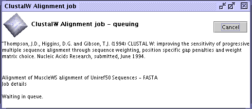 This dialog box is displayed when a web service job is submitted. It gives the name of the service and any method citation information, and monitors the progress of the calculation. The cancel button will permanently cancel the job, but this is only possible for some services.